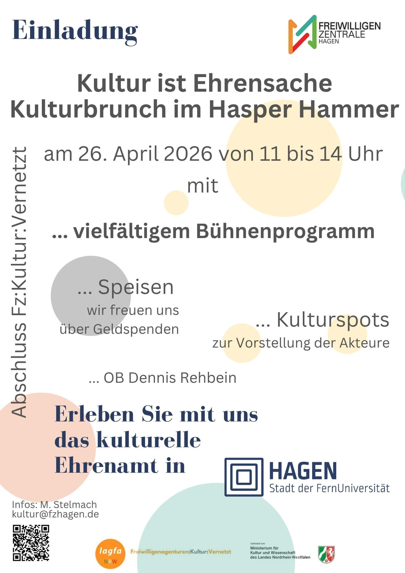 Die Freiwilligenzentrale Hagen lädt alle interessierten Hagener*innen zu einem ereignisreichen Brunch im Hasper Hammer ein, welcher den Abschluss des Projekts „FZ:Kultur:Vernetzt“ bildet.